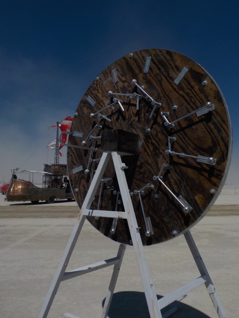 DaVinci had a facination with perpetual motion machines.Playaforever is an adaptation of one of his designs. With a little help from the burners, it truely rotated forever. The wheel is 10' feet high at the top. As it turned, synchronized lights added an additional show.